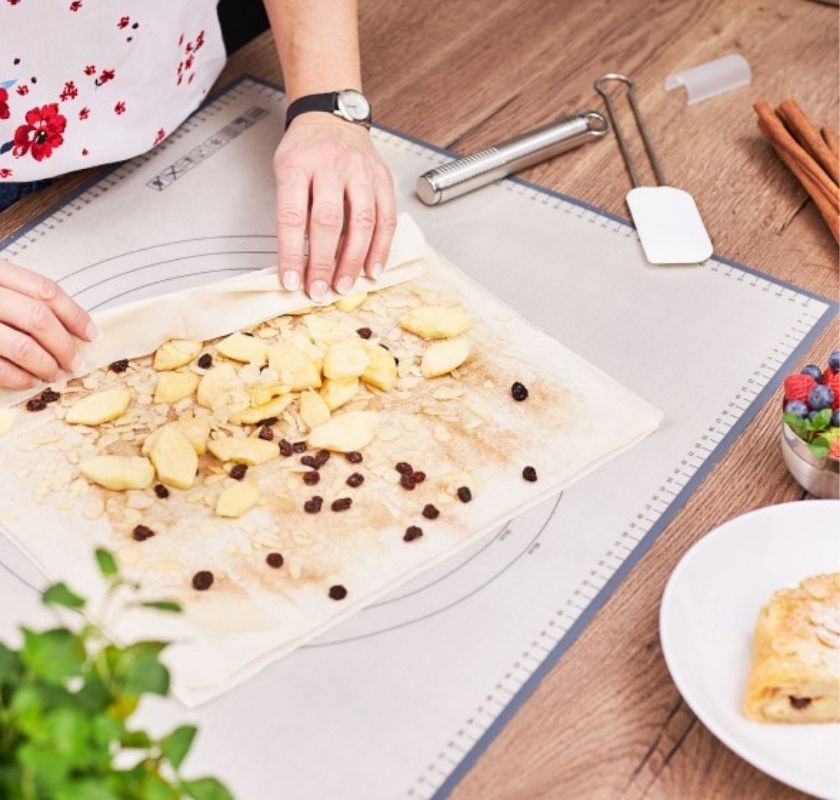 Använd arbetsmatta silikon som underlag vid kavling av exempelvis smördeg, pajdeg, marsipan och sockerpasta eller knådning av deg och som hygienisk bakduk.