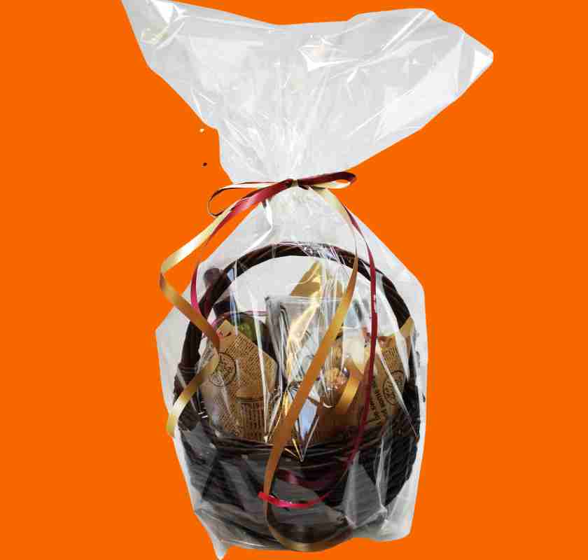 Fin påse i prasslig plast stor nog att rymma en presentkorg, presentlåda eller blomster-bukett.