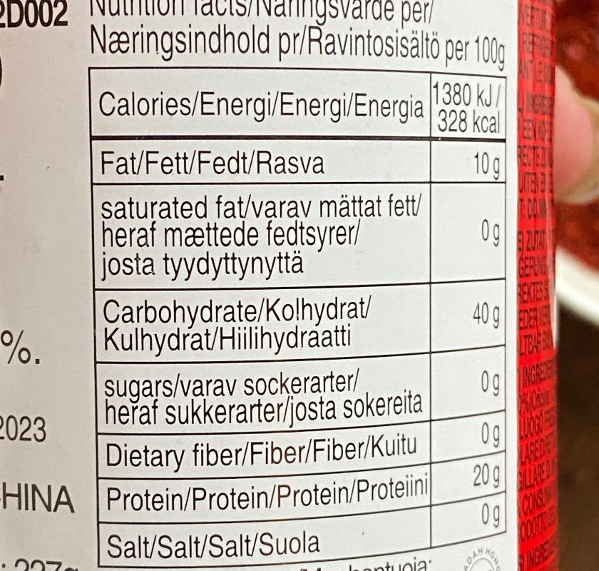 Energi: 1380kj / 328kcal fett: 10g, varav mättade: 0g, kolhydrater: 40g, varav sockerarter: 0g, protein: 20g, salt: 0g.