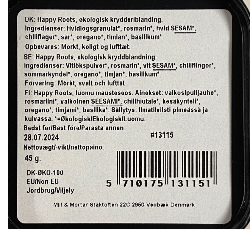 Happy Roots är en underbar ekologisk örtblandning med sesam och lite chili för kryddning av alla typer av rotfrukter. Strö den över potatis eller andra rotfrukter som vänts i lite olivolja och salt för att sedan bakas i ugnen. Blandningen kan också användas som krydda till potatismos och andra mos av rotfrukter, rösti, pommes frites eller rotfruktsbiffar.