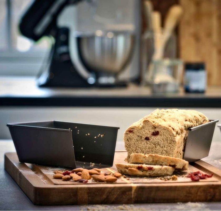 En anpassningsbar kakform för avlånga bröd och kakor sparar dessutom utrymme i skåp och lådor.