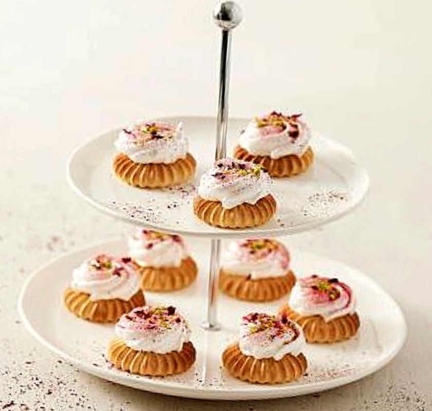 Vackert kakfat i 2 våningar med tallrikar i vitt porslin och metallställning som skruvas in mellan faten.