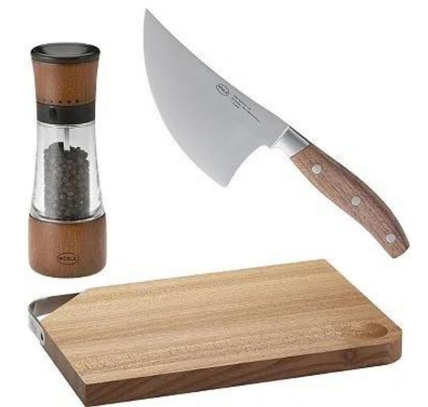 Krydd- och örtsettet från Rösle innehåller en kryddkvarn, en skärbräda med ett rostfritt stålhandtag och en fin örtkniv.