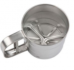Mjölströare av rostfritt stål. Sikten är bra att använda då man vill avlägsna klumpar från exempelvis mjöl eller kakao som ska blandas i en kaksmet.