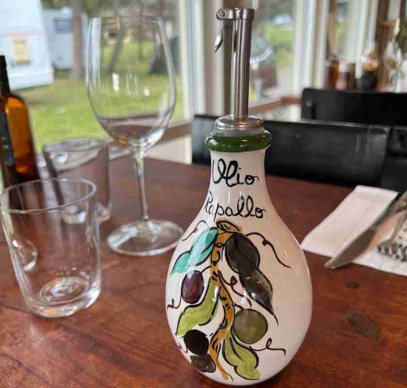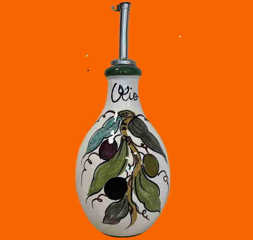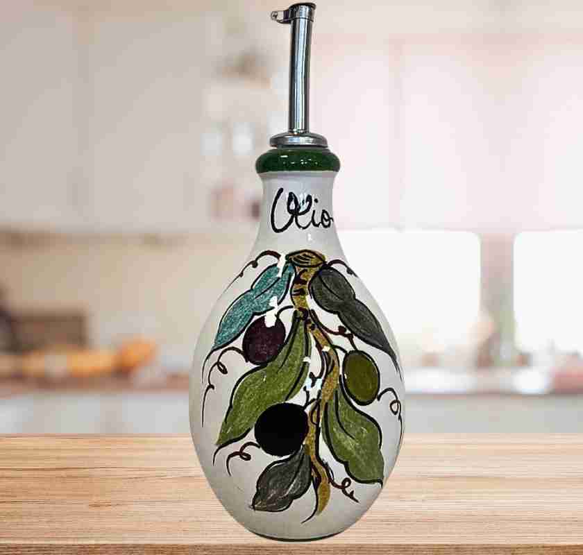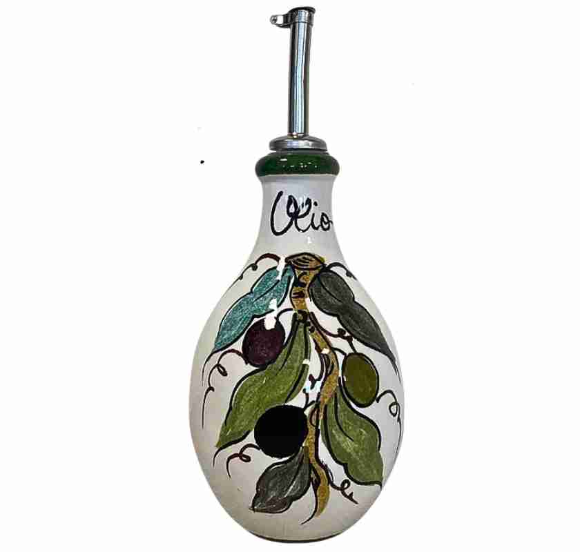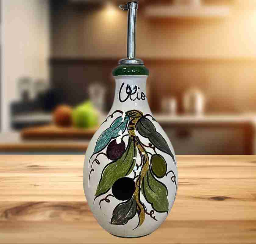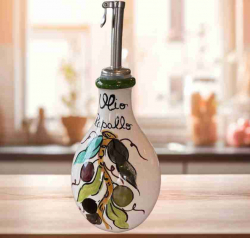 Vacker olivoljeflaska i keramik med handmålade oliver – direkt från Italien. Rymmer 0,25 liter och levereras med praktisk hällpip som gör det enkelt att dosera utan dropp och spill. Perfekt för olivolja, citronolja eller annan matolja, och lika snygg på köksbänken som på middagsbordet.