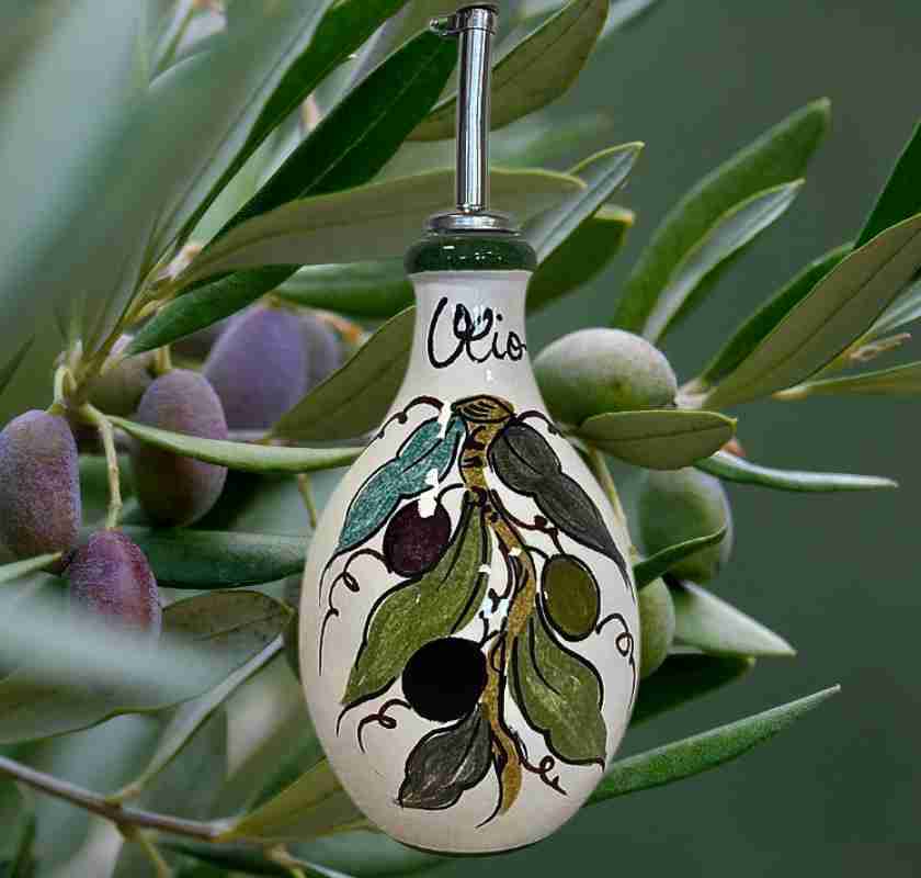 Olivoljeflaska i keramikmed motiv av oliver– handmålad italiensk design