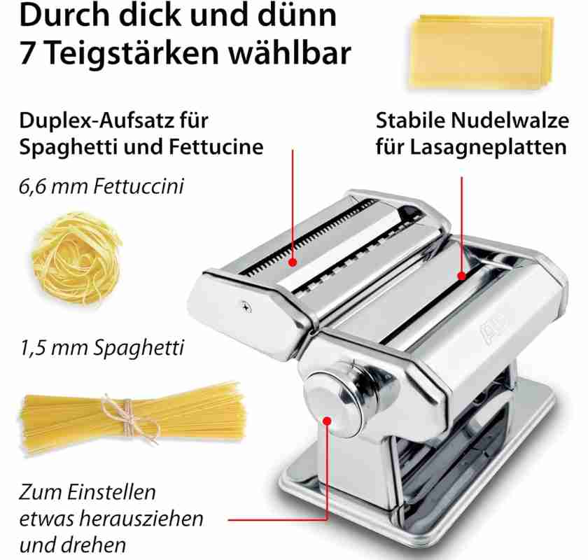 Pastadegen kan kavlas i sju olika degtjocklekar och skäras till spagetti eller fettuccine direkt i maskinen.
