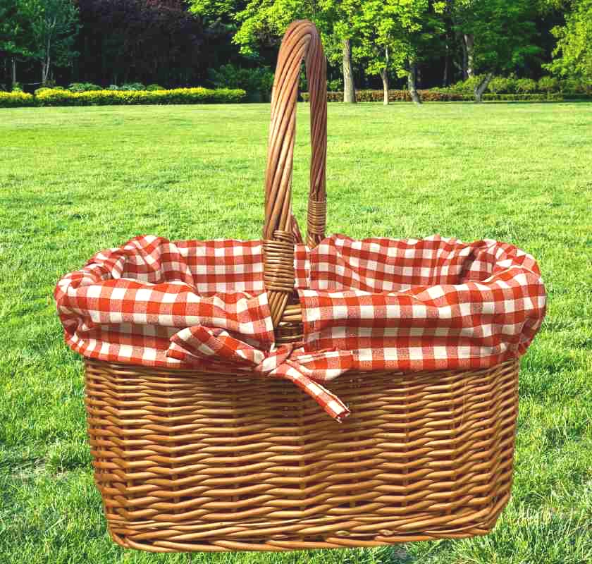 Den här fina flätade korgen med plats för bestick, glas och mat är fodrad med klassiskt röd-vit-rutigt tyg är redo att packas med det mesta du kan tänkas behöva inför picknicken. Utflyktskorg avi flätad pi med öppen ovandel och ett stadigt handtag.