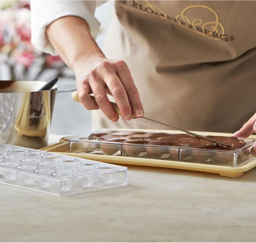 När chokladen har stelnat helt, vändes formen över en ren kökhandduk och bankas lätt mot bordet så att pralinerna frigörs.