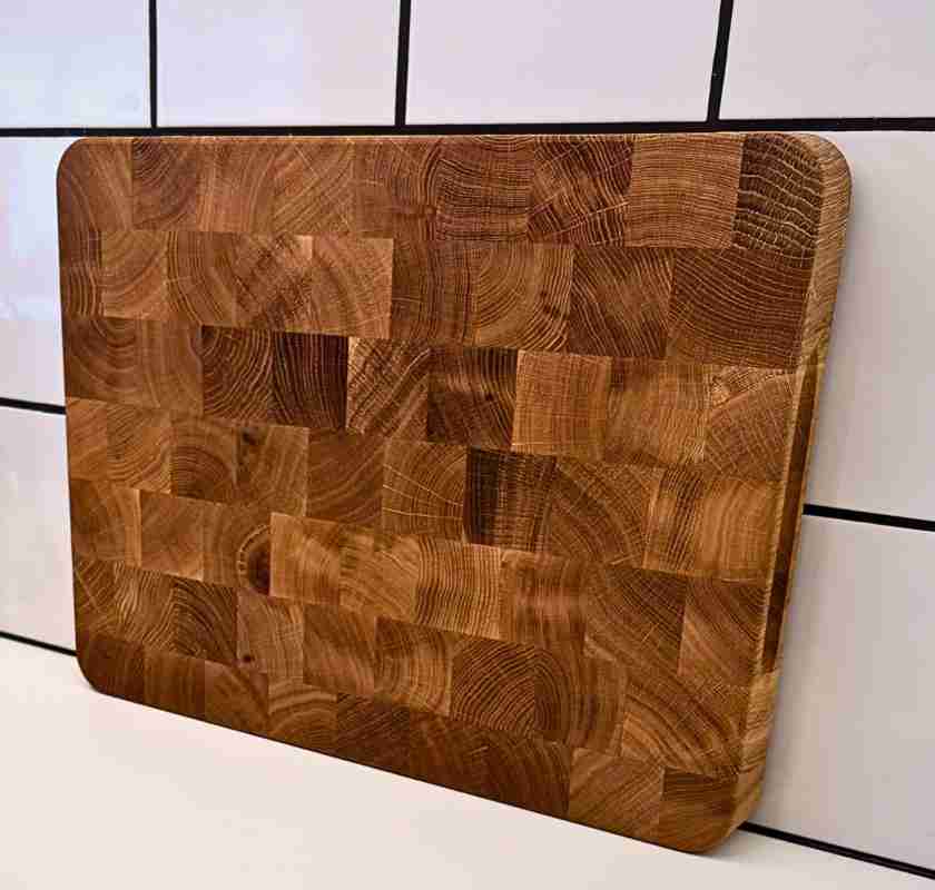 Exklusiv slät träskärbräda av stavlimmat massivt ändträ från nordiska ekar med utskurna handtag på sidorna som med rätt skötsel håller i generation efter generation.