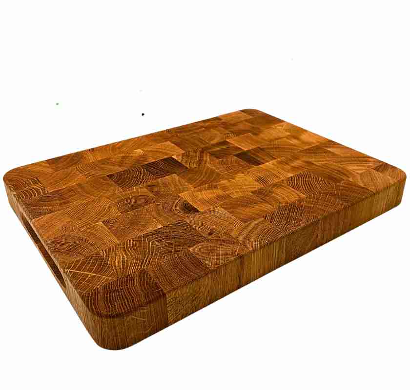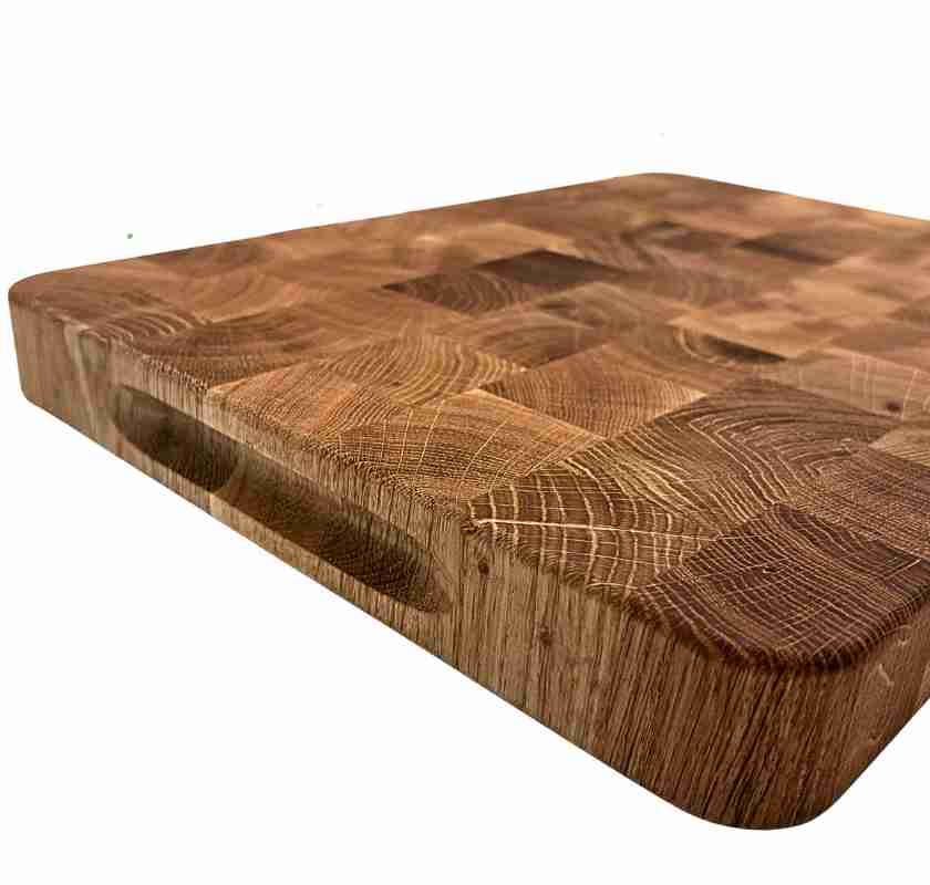 Exklusiv träskärbräda av stavlimmat massivt ändträ av ek slät med utskurna handtag eller grepp i sidorna. Ett slaktarblock som med rätt skötsel håller i generation efter generation.