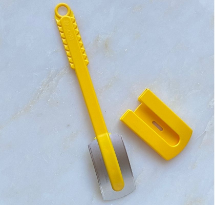 Kniv tillverkad av gul plast och INOX (rostfritt stål).