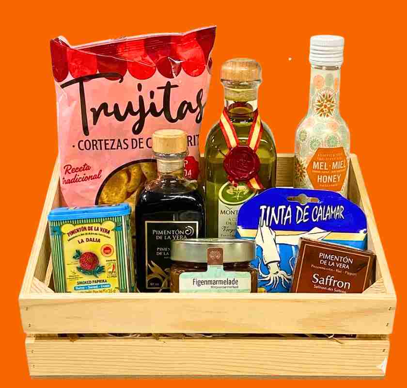 Delikatesslåda eller presentkorg till den som älskar Spanien, dess livliga kultur och fantastiska mat, presenterar vi den Stora Spanska Presentlådan – en exklusiv matpresent eller presentkorgt fylld med autentisk spansk mat och delikatesser. Allt packat i en fin trälåda med cellofan och band.