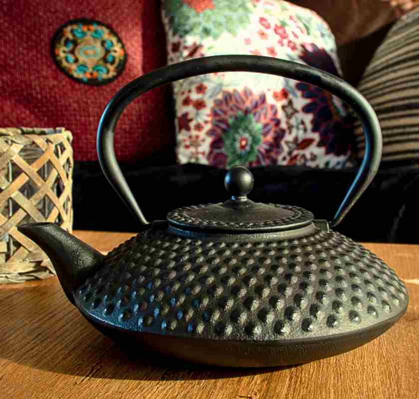 Tekanna i svart järn med vackert japanskt knottrigt mönster.