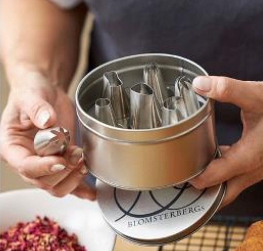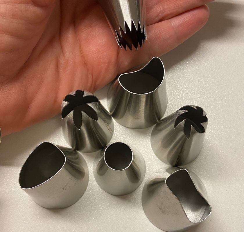 Tyllar 12-13 mm, i en fin metalllåda som passar till spritsning av småkaksdeg, crème, maränger, grädde, dekorationsspritsning och kransekagedeg.