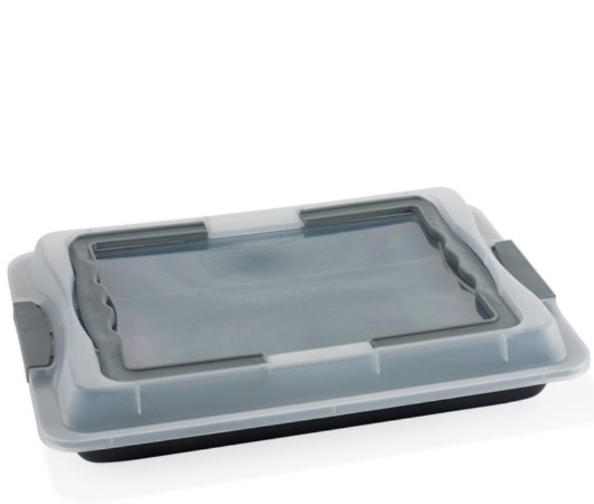 Stor långpanna eller braspanna med PFOA/PTFE-fri non stick coating perfekt för transport av bakverk och lagad mat. Det här är den idealiska prylen för att ta med mat eller bakverk till landet, fjällen eller till knytkalaset.