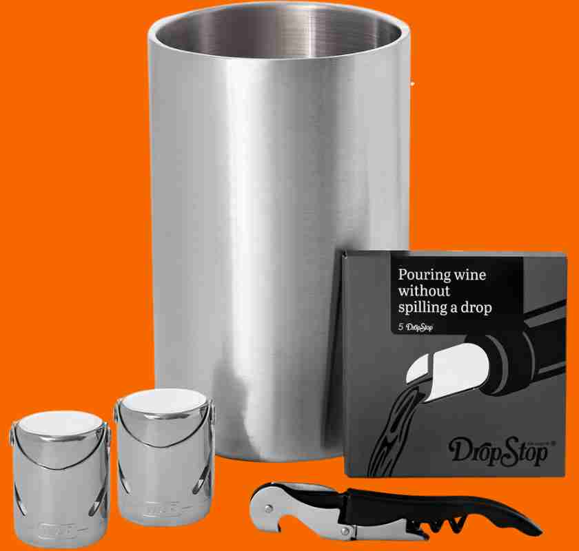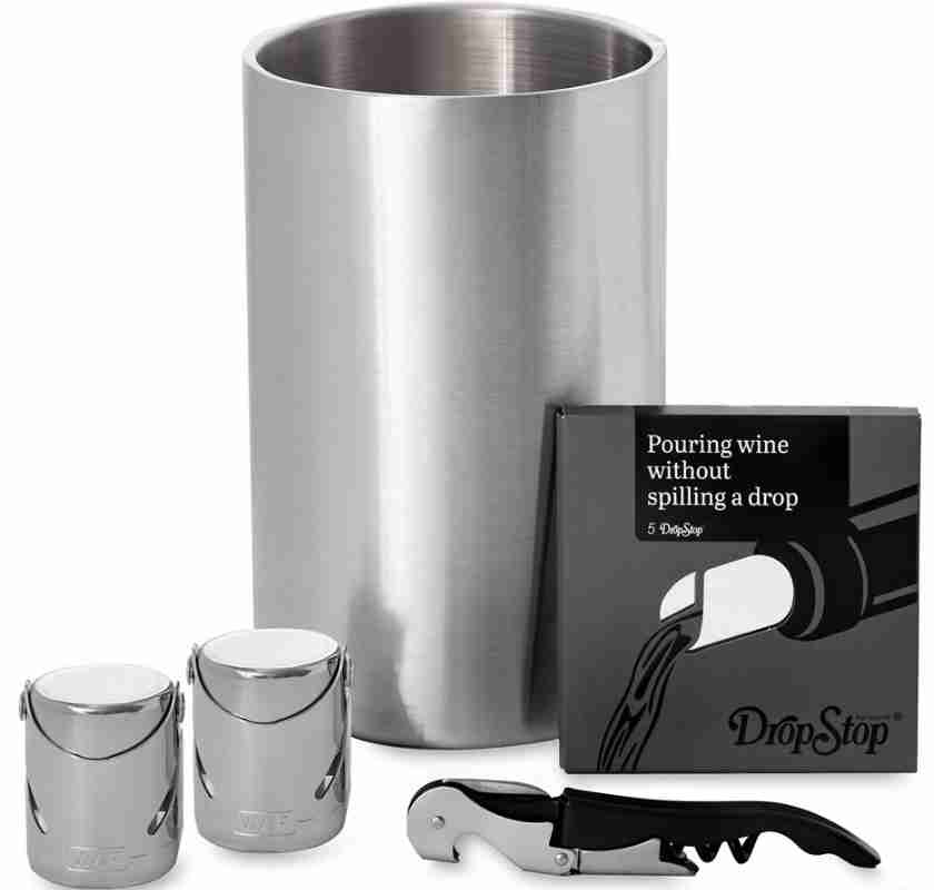 Den rostfria vinkylaren håller vinet svalt längre, medan de två kromade vin- och champagnepropparna gör att du enkelt kan återförsluta flaskor utan att tappa smaken.