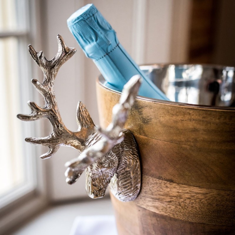 Vinkylare eller champagnekylare i mangoträ med hjort eller bockhuvud med horn i vit metall.