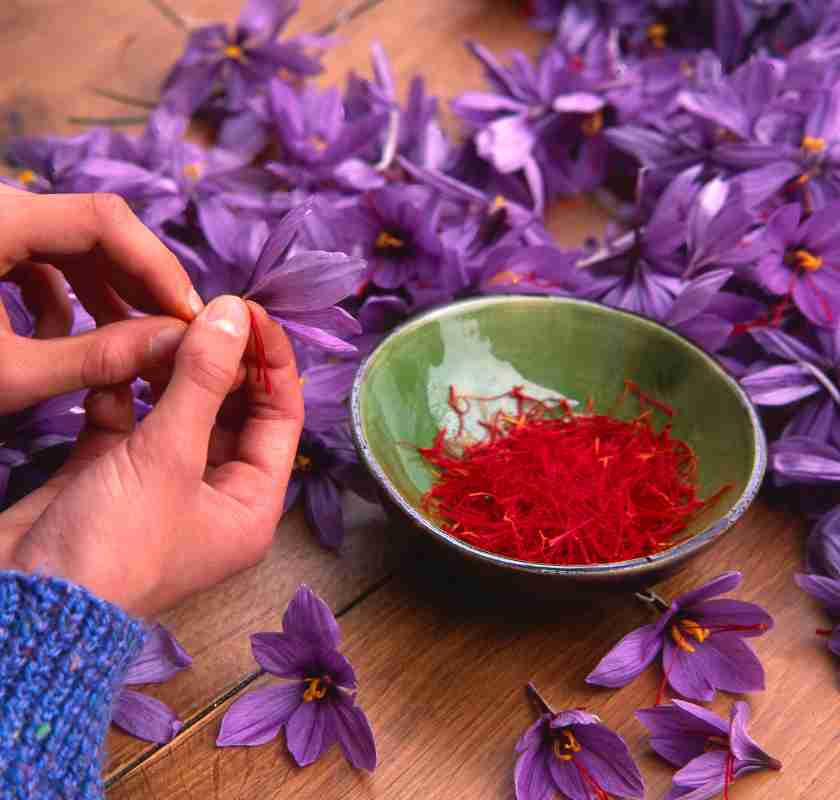 Saffran framställs av pistillerna i Crocus sativus-blomman. Varje blomma producerar bara några få trådar och allt plockas för hand. Den arbetsintensiva skörden och den lilla mängden per planta gör saffran till en av världens dyraste kryddor.